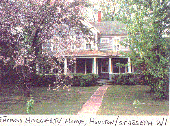 From "Red" Haggerty (son of Edmond P Haggerty in the Peter Haggerty Jr line); "Uncle Tom Haggerty originated in Houlton Maine and about more or less emigrated to Wisconsin where he opened up a general merchandise store on the Wisconsin side of the St Croix River and christened the town, that grew up around his store, Houlton. I can still remember him, shorter than our dad and more heavy set, but the same type of mould. Besides the store he was the postmaster also. I do not remember when or how he died but do recall that he turned the store over to E. P.